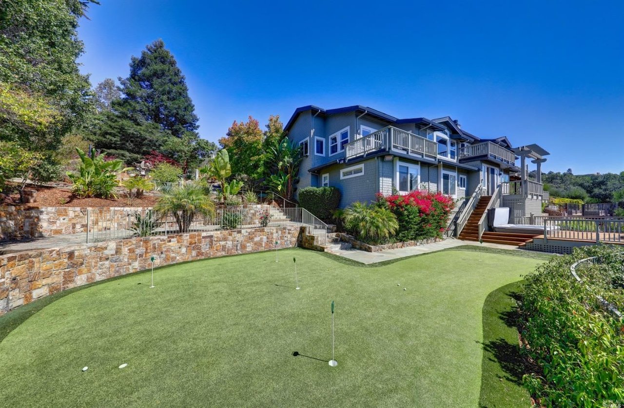 Enjoy indoor/outdoor living at this spectacular Tiburon residence, set on approximately 3/4 of an acre of land. The park-like grounds feature extraordinary landscaping and a multitude of exterior living spaces with a turf putting green, hot tub, bocce ball court, vegetable gardens and fruit trees, and meandering pathways. This stunning home features great scale and an inviting floor plan with sweeping views of the valley. Hardwood floors living-kitchen-family-master-office. Living room with sliding doors perfectly framing the picturesque views. Beautifully remodeled, chic, and stylish chef's kitchen with high-end stainless steel appliances, counter seating, & wet bar with a sparkling water system and custom ice cube maker; adjacent casual dining area and large adjoining family room. The oversized primary suite is off of the main level with a separate office (or ideal nursery). Private theater with a large screen located on the main level. The lower level features 4 bedrooms,3 bathrooms,2nd family/media room, and a wine cellar. Only steps to private open space trails